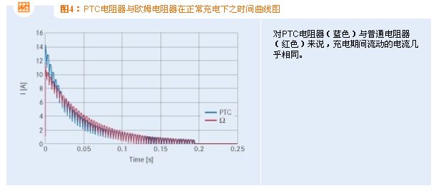 在這兩種情況下,充電電流的時間曲線幾乎相同。PTC陶瓷與固定電阻在電流特性方面的細(xì)微差別的產(chǎn)生原因是: