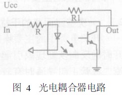 圖4 光電耦合器電路脈沖變壓器的匝數(shù)較少,而且一次繞組和二次繞組分別繞于鐵氧體磁心的兩側(cè),它的分布電容很小,僅為幾個(gè)皮法,可作為脈沖信號(hào)的隔離元件。脈沖變壓器傳遞輸入、輸出脈沖信號(hào)時(shí),不傳遞直流分量,因而在微電子技術(shù)控制系統(tǒng)中得到了廣泛的應(yīng)用。