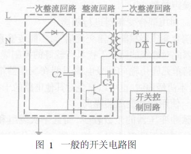 單片機(jī)的開(kāi)關(guān)電源工作時(shí),其內(nèi)部電壓和電流波形都以非常短的時(shí)間上升和下降,所以開(kāi)關(guān)電源本身就是一個(gè)射頻干擾產(chǎn)生源。開(kāi)關(guān)電源產(chǎn)生的干擾,按噪聲干擾源種類(lèi)來(lái)分,可以分為尖鋒干擾和諧波干擾;若按耦合通路來(lái)分,可分為傳導(dǎo)干擾和輻射干擾,開(kāi)關(guān)電路框圖如圖1。