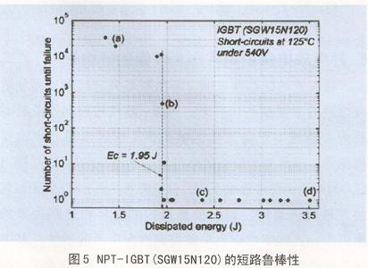 NPT—IGBT的魯棒性見(jiàn)圖5,被測(cè)器件是SGW15N120。在540V 125℃時(shí)測(cè)試。X軸是耗散的能量。Y軸是器件直至損壞的短路周期次數(shù)。