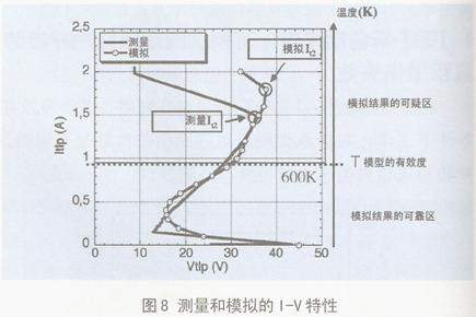圖8是NPN管測(cè)量的和用(2)假定來(lái)模擬的I-V特性。由圖8可見(jiàn),測(cè)量的損傷電流IT2=1.5A,而模擬值是1..8A,有較大誤差。