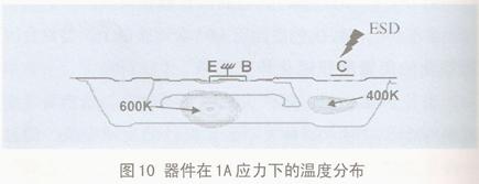圖10是1A電流應(yīng)力下,模擬顯示該器件有兩個(gè)熱點(diǎn)。一個(gè)在收集極觸點(diǎn)下,損傷電流IT2=1.52A;另一個(gè)熱點(diǎn)在發(fā)射極之下,用外推法算出的損傷電流遠(yuǎn)大于2A。所以,首先出現(xiàn)導(dǎo)致失效的硅熔融點(diǎn)應(yīng)在收集極。