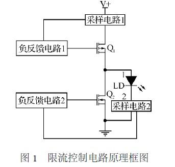 Q1為P型MOS管,Q2為N型MOS管。流過Q1的電流通過采樣電路1變為電壓信號與基準電壓相比較,通過負反饋電路1控制,可使得流過Q1的電流恒定。通過半導體激光器LD的電流經過采樣電路2變為電壓信號與電流調節端電壓相比較,如果流過半導體激光器的電流超過設定值,經過負反饋電路2調節使得通過Q2的電流增加,導致通過LD電流減小;流過LD的電流太小,經過采樣電路2、負反饋電路2調節可使得流過Q2的電流變小,導致流過LD的電流變大,如此反復,通過負反饋電路的控制可使得流過半導體激光器的電流恒定,這種負反饋過程建立的時間很快。
