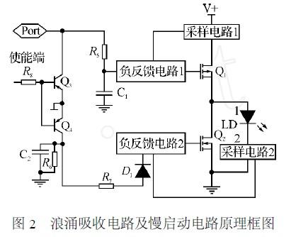3)在直流電源和激光器之間增加慢啟動電路使供給激光器的電壓緩慢升高,避免突然上電或斷開電源時給器件造成的沖擊,同時,此舉還能避免電路中分布電感引起的浪涌沖擊。這種電路是必不可少的而且是切實有效的。