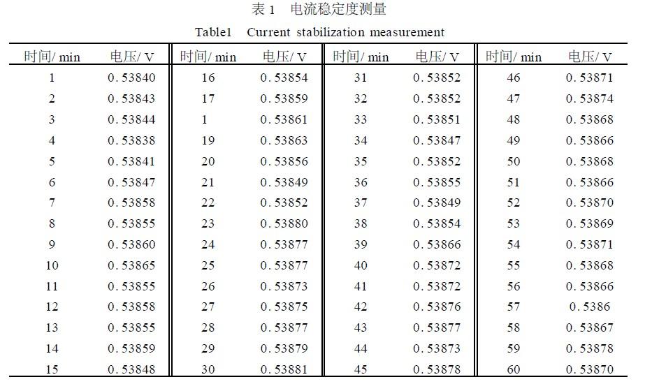 驅動電源一個重要技術參數為電流穩定度。電流穩定度是在一定時間內,多次測量通過負載的電流大小,然后通過數學計算得出輸出電流穩定度大小。實驗中每間隔一分鐘測量一次,測量時間持續一個小時。測量時,用1.2Ω50W電阻作為模擬負載,測量模擬負載的兩端電壓,用模擬負載兩端電壓穩定性來標定電流穩定性。測量儀器為:電壓測量儀器:Agilent34401A61/2digitmultime2ter,其精度可以達到0.00001V;供電電源為Agi2lentE3631AtripleoutputDCpowersupply12V,1A。電流穩定度實驗數據如表1所示。