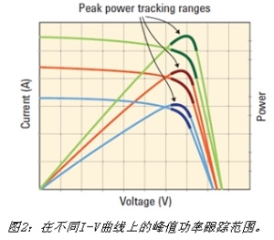 如果目標是為了驗證峰值功率追蹤電路的性能,開發出能在不同環境條件下始終工作在I-V曲線最大功率點上的太陽能逆變器,在電路的設計和開發中就必須考慮峰值功率跟蹤范圍和跟蹤頻率。峰值功率跟蹤范圍是I-V曲線最大峰值功率點附近的一段區間,這也是逆變器峰值功率跟蹤電路算法的工作區間,跟蹤頻率則是工作區間內曲線的擺動速率,如圖2所示。為確保逆變器在模塊I-V曲線變化時始終能夠找到最大峰值功率點,它必須具有足夠寬的跟蹤范圍和足夠高的跟蹤頻率。為驗證設計的有效性,需要根據精確復現太陽能電池板的I-V曲線來驗證在不同曲線下逆變器能否穩定地工作在峰值功率點附近。
