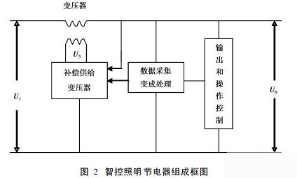 智控照明節電器主要由主變壓器、補償供給器、數據采集與編程處理、輸出和操作控制等四大部分組成(見圖2)。