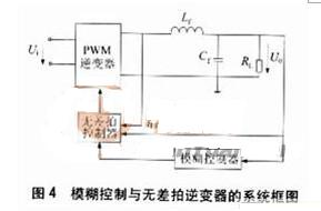 將輸出電壓和濾波電感電流反饋,即電壓誤差和電感電流作為輸入模糊變量,可以實現(xiàn)逆變器的模糊控制,整流性負載時,其輸出電壓總諧波失真(total harmonic distortion,TH)小于5%,將模糊控制與無差拍控制相結(jié)合,可用來補償由于非線性負載導致的電壓降落,其系統(tǒng)如圖4所示。模糊控制從模仿人的思維外特性入手,模仿人的模糊信息處理能力。它對系統(tǒng)的控制是以人的經(jīng)驗為依據(jù)的,而人的經(jīng)驗正是反映人在思維過程中的判斷、推理、歸納。理論上已經(jīng)證明,模糊控制可以任意精度逼近任何線性函數(shù),但受到當前技術(shù)水平的限制,模糊變量的分檔和模糊規(guī)則都受到一定的限制,隸屬函數(shù)的確定還沒有統(tǒng)一的理論指導,帶有一定的人為因素,因此,模糊控制的精度有待于進一步提高。