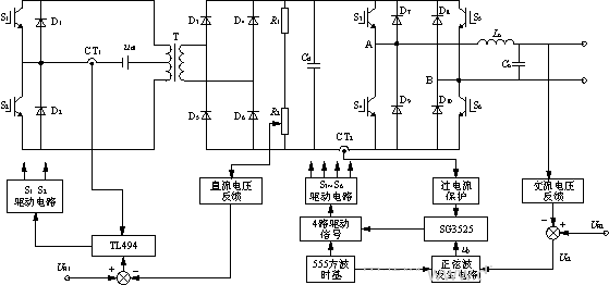 再經(jīng)過全橋DC/AC逆變電路,得到220V/50Hz交流電壓輸出。為保證系統(tǒng)可靠運行,防止主電路對控制電路的干擾,采用主、控電路完全隔離的方法,即驅(qū)動信號用光耦隔離,反饋信號用變壓器隔離,輔助電源用變壓器隔離等。