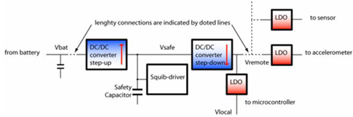 以下簡單介紹氣囊系統的充氣過程。氣囊系統設有升壓轉換器,一般來說,這些升壓轉換器都采用 sepic拓撲(sepic拓撲要求電路中采用兩個電感) 或回掃拓撲結構(回掃拓撲中需要采用一個變壓器)。進行充氣之前,氣囊系統的升壓轉換器會先將電池電壓(Vbat)提高(這個電池電壓在負載突降時可高達 40伏),直至達到安全電壓(Vsafe)要求的電平,這樣可確保安全電容器儲存大量電能(見圖2)。之后才將這個較高的安全電壓調低至幾伏,這個較低的電壓稱為遠程電壓(Vremote)。必須嚴格按照這個充氣準備程序,以確保其后幾級的低壓降穩壓器出現較少壓降。壓降越少,功耗也就越低,效率也就越高。
