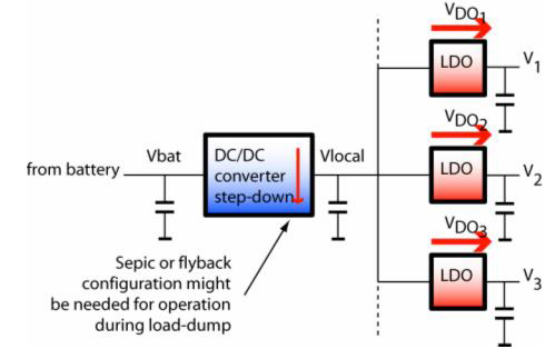 我們若采用開關穩壓器作為輸入級,再以多個低壓降穩壓器提供輸出,便可降低電源系統的整體成本。高功率的電源系統甚至必須采用這樣的設計。圖4是其中一個示例。