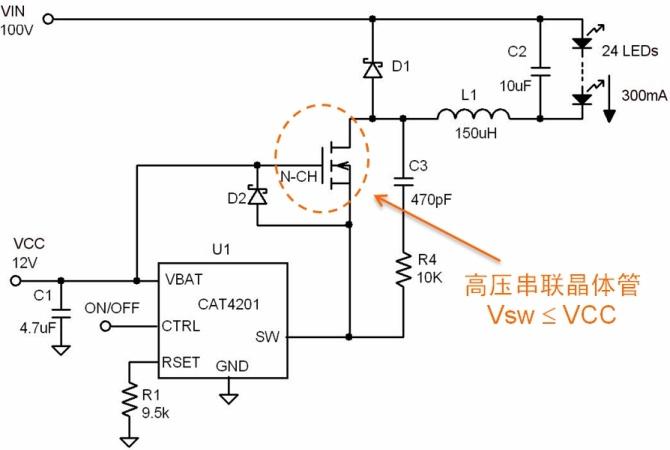 在這種模塊化途徑下,一項設計能夠擴展用于多種光輸出等級。而且隨著LED光輸出性能增強,LED模塊要提供相同光輸出等級,所需采用的燈條就更好。而每個燈條都設有一個專用的DC-DC LED驅動器,如可以采用安森美半導體的CAT4201高能效降壓LED驅動器。CAT4201專門優化用于驅動大電流LED,采用具有專利的開關控制算法,提供高能效及精確的LED穩流(可達350 mA)。CAT4201可采用最高36 V的電源電壓供電,并兼容于12 V和24 V標準照明系統。圖3顯示的是CAT4201的高壓LED驅動器配置,外圍的N溝道MOSFET支持高壓輸入:100 V輸入電壓時LED功率達30 W;50 V輸入時LED功率達13 W。