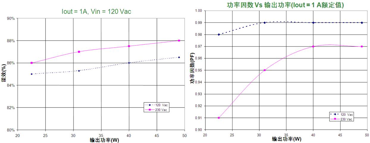 這90 W恒壓恒流演示板接受90至265 Vac的擴展通用輸入電壓(更換元件條件下可支持305 Vac),提供0.7 A至1.5 A的恒定電流輸出范圍(可通過微幅調節電阻來選擇)及30 V至55 V的恒定輸出電壓范圍(可通過電阻分壓器來選擇),最大輸出功率90 W,支持50至1,000 Hz調光控制,并包含可連接至可選調光卡的6引腳接口,用于模擬電流調節/雙亮度等級數字調光等智能調光應用。此外,這演示板還提供短路保護、開路保護、過溫保護、過流保護及過壓保護等豐富保護特性。測試顯示,這演示板在50 W輸出功率、1,000 mA輸出電壓/48 V正向壓降條件的能效高于87%(詳見表1),在50%至100%負載條件下功率因數高于0.9,同時符合IEC61000-3-2 C類設備諧波含量標準。
