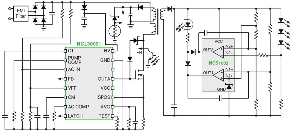 NCL30001是一種整體式/單段式的LED驅動方案,這種方案集成了PFC和隔離型DC-DC轉換電路,并提供恒定電流來直接驅動LED。這種方案相當于將AC-DC轉換與LED驅動兩部分電路整合在一起,均位于照明燈具內,省下了LED光條中集成的線性或DC-DC轉換器。這種整體式方案的電源轉換段更少,減少元器件使用數量(如光學元件、LED、電子元件及印制電路板等)、降低系統成本,并支持更高的LED電源總體能效。當然,這種方案的功率密度更高,可能并不適合所有區域照明應用,其光學圖案可能更適合較低功率的LED,典型應用包括LED街燈、外墻燈、洗墻燈及電冰箱箱體照明等。
