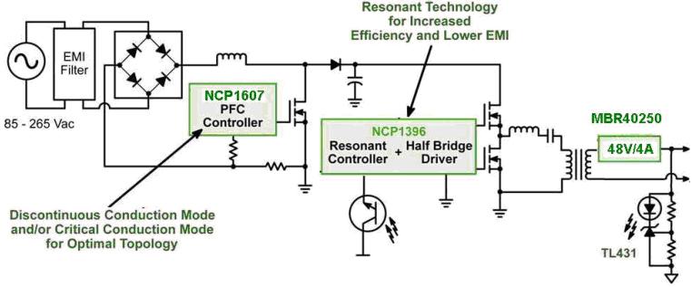 在這類要求超高能效的更大功率LED區域照明應用中,可以結合采用安森美半導體的NCP1607 PFC控制器和NCP1397雙電感加單電容(LLC)半橋諧振控制器,用于功率在50到300 W范圍的高能效LED街道照明應用。NCP1397是最新高性能諧振模式LLC控制器,集成了600 V高壓浮動驅動器,支持50到500 kHz的高頻工作,內置高端和低端驅動器,支持可調節及精確的最低頻率,提供極高能效,并具備多種故障保護特性。