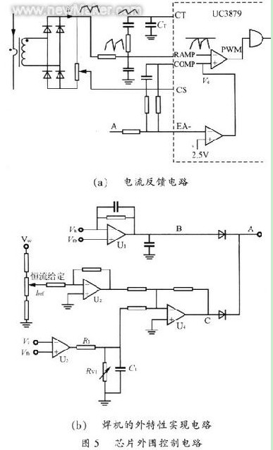 (2)外拖特性實現(xiàn) 正常工作時,輸出電壓反饋值Vfb大于外拖給定值Vz,比較器U3的輸出為零,對加法器U4沒有影響,焊接電流由恒流給定值Iref決定;當焊槍與工件粘連短路時,Vfb小于VZ,比較器U3的輸出為高,相當于給增大了Iref,UC3879內部誤差放大器的輸出Ve也增大,焊接電流則隨之增大,從而實現(xiàn)外拖。