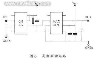 其中IN接自來于UC3879的輸出脈沖信號,CND1接控制電路地信號,GND2接被驅動MOS-FET的源極。6N137是一個高速光耦,傳輸延遲時間僅有40 ns。從控制電路來的信號經過光耦隔離后送至驅動電路,使得控制電路和驅動電路有較好的電氣隔離,消除對控制電路的十擾。MAX4426是一個專門用于M0SFET的高頻驅動芯片,其內部有兩個驅動電路,可以很容易地并聯(lián)以提供較大的輸出功率。典型上升、下降時間僅為20ns,延遲時間小大于40ns,可工作于1MHz,提供1.5A的峰值輸出電流。