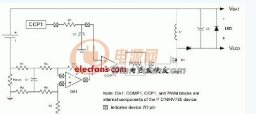 PIC16HV785幾乎包含了實(shí)現(xiàn)大功率LED驅(qū)動(dòng)電路所需要的元器件。根據(jù)輸入電壓范圍,可以方便地配備成升壓或降壓-升壓工作模式。這一應(yīng)用僅使用了單片機(jī)RAM和閃存的一小部分,為其他用戶應(yīng)用程序代碼留下了足夠的空間。實(shí)際上,PIC16HV785單片機(jī)中還有足夠的未用外設(shè),可用來實(shí)現(xiàn)其它LED驅(qū)動(dòng)器、電池充電器或開關(guān)電路。