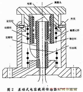 差動(dòng)式電容載荷傳感器結(jié)構(gòu)示意圖如圖2所示。它主要由測(cè)量頭、外殼、敏感元件(彈性體)、定極柱、動(dòng)極柱、電極、等位環(huán)、引出線(xiàn)等構(gòu)成。其特點(diǎn)為:測(cè)量范圍寬;靈敏度高,便于拾取信號(hào);極板間不接觸、不變形、不磨損,機(jī)械損失小、壽命長(zhǎng);電容傳感器受溫度影響小;動(dòng)態(tài)性能好;結(jié)構(gòu)簡(jiǎn)單、適應(yīng)各種惡劣環(huán)境和場(chǎng)合。