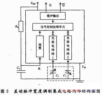 差動(dòng)式電容載荷傳感器是將被測(cè)載荷的變化轉(zhuǎn)換為電容量的變化輸出,而電容傳感器所產(chǎn)生的電容量很微小,電容極板引線(xiàn)與地之間產(chǎn)生的雜散電容往往大于被測(cè)電容。因此小電容轉(zhuǎn)換測(cè)量技術(shù)一直被人們所重視。然而,一般的檢測(cè)電路結(jié)構(gòu)比較復(fù)雜,精確度較低,不能滿(mǎn)足測(cè)量要求。為了提高測(cè)量的靈敏度,針對(duì)差動(dòng)式電容載荷傳感器,在基于四相檢測(cè)技術(shù)的電荷轉(zhuǎn)移式電容檢測(cè)電路的基礎(chǔ)上,設(shè)計(jì)采用了差動(dòng)脈沖寬度調(diào)制集成測(cè)量電路,該電路具有集成度高、實(shí)現(xiàn)了電容傳感器頭有源化、輸出脈沖方波、省去高頻激勵(lì)信號(hào)源、功耗低、抗干擾能力強(qiáng)、分辨率高等特點(diǎn),尤其適合差動(dòng)式電容傳感器的測(cè)量。其內(nèi)部結(jié)構(gòu)框圖如圖3所示,圖中的虛線(xiàn)框內(nèi)為差動(dòng)式電容傳感器的兩個(gè)可變電容C1和C2。