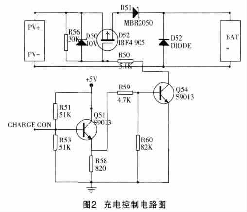 單片機(jī)(P2.0)給出充電的控制信號(hào),即P2.0=1,NPN 型S9013 的三極管導(dǎo)通,由于此三極管工作于射極輸出狀態(tài), 其發(fā)射極為高電平,Q54 (2SD667)NPN 三極管導(dǎo)通, 由于穩(wěn)壓管D50的作用, 使得IRF4905管的柵源電壓鉗位在-10V,IRF4905 管導(dǎo)通, 太陽(yáng)電池向蓄電池充電。反之,前兩極三極管均截止VGS=0V,IRF4905 管斷開,太陽(yáng)電池不能向蓄電池充電。