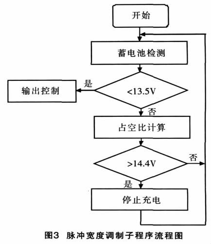 具體方案是,當(dāng)檢測(cè)到蓄電池的電壓小于13.5V時(shí),開關(guān)管始終接通,即采取全通充電方式,如果檢測(cè)到蓄電池電壓大于13.5V 并小于14.4V 時(shí)采取脈寬調(diào)制方式充電,隨著蓄電池電壓的增加,脈寬不斷的變窄,直到蓄電池端電壓上升為14.4V 時(shí),脈寬檢校為0,停止充電。脈寬調(diào)制方式由軟件來(lái)實(shí)現(xiàn)。