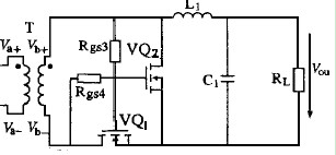 當(dāng)變壓器次級同名端電壓為負,VQ1關(guān)斷,VQ2開通。負載電流通過VQ2續(xù)流。這就是同步整流的基本原理。