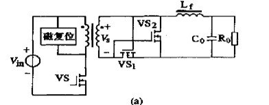 當(dāng)主開關(guān)管VS 關(guān)斷時,勵磁電流流經(jīng)磁復(fù)位電路。變壓器次級電壓反向,VS1 和VS3 關(guān)斷。VS2 的柵2源極寄生電容由流經(jīng)VD 的電流充電。輸出電流由VS2 續(xù)流。在t2 時刻,磁復(fù)位結(jié)束,變壓器次級電壓為零。因為VD1 承受反壓截止,VS3 關(guān)斷,VS2 的柵極驅(qū)動電壓不變,因此即使變壓器次級電壓為零,VS2 保持導(dǎo)通續(xù)流。VS2 柵極驅(qū)動電壓一直保持到下一個開關(guān)周期開始,且VS3 導(dǎo)通之時。這就解決了死區(qū)時間內(nèi)體二極管導(dǎo)通的問題。