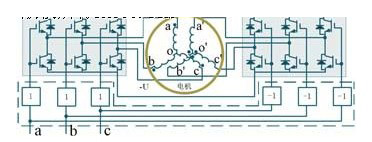 為了消除pwm電機驅(qū)動系統(tǒng)共模電流,a.consoli等學(xué)者基于共模電壓補償技術(shù),提出了一種應(yīng)用于由兩個或多個功率變換器組成的多驅(qū)動系統(tǒng)公共直流母線共模電流消除技術(shù),拓?fù)浣Y(jié)構(gòu)見圖6所示。該方法是在兩個功率變換器做適當(dāng)連接的基礎(chǔ)上,通過控制兩個變換器狀態(tài)序列而使共模電壓同步變化的新pwm調(diào)制策略。