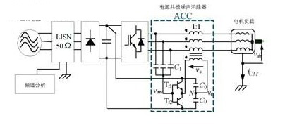 傳統(tǒng)的用于消除共模電壓的有源濾波器如圖8所示,文獻將其稱為有源共模噪聲消除器,acc連接在逆變器的輸出端和三根電纜之間,由共模電壓傳感器、補償電路和共模變壓器組成,acc在逆變器輸出端疊加一個補償電壓,該補償電壓與pwm逆變器產(chǎn)生的共模電壓極性相反、幅值相等,從而使施加在負(fù)載上的共模電壓被完全消除,也就減小了共模電流和傳導(dǎo)emi。