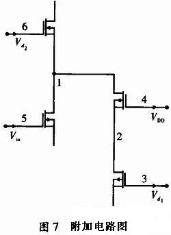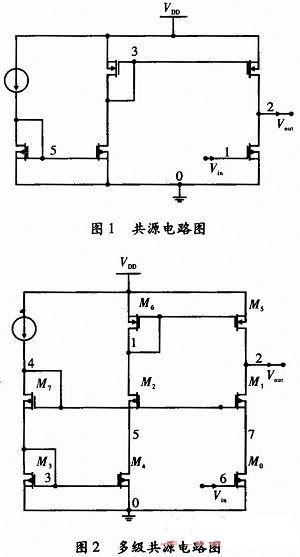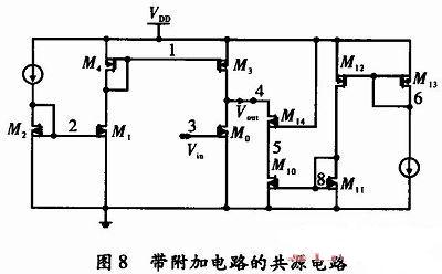 帶附加電路的共源電路如圖7和圖8所示,消除了使用工作以線性范圍內(nèi)的共源放大器,從VDD到輸出節(jié)點電源波動的影響。