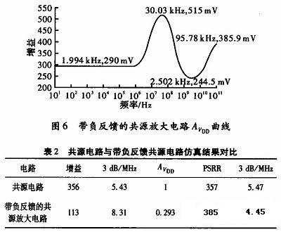 通過從VDD到輸出端能夠反方向影響電源波動的負增益改善PSRR,從而反映到放大電路的輸出端。共源放大器為應(yīng)用這一技術(shù)提供了支撐,結(jié)果已被證實。