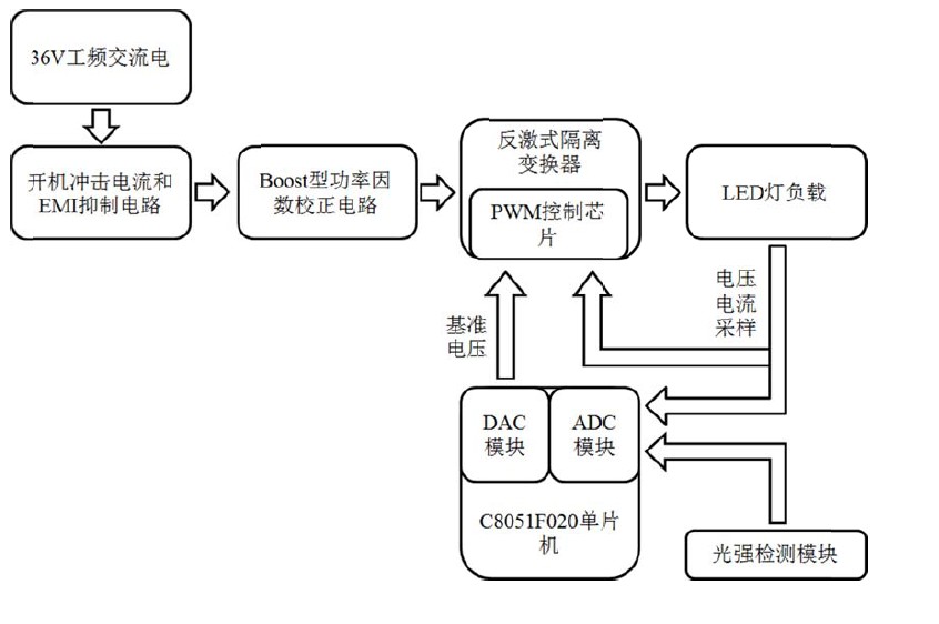 220VAC經工頻變壓器降壓為36VAC,經開機沖擊電流抑制電路輸入到功率因數校正電路中,再經高頻隔離變壓器給串聯在一起的LED燈供電,在LED燈處分別進行電壓、電流采樣,返回給PWM控制芯片和單片機,由單片機給定基準電壓來控制PWM控制芯片,進而達到控制LED燈恒流可調的目的。系統總體結構框圖如圖1所示。