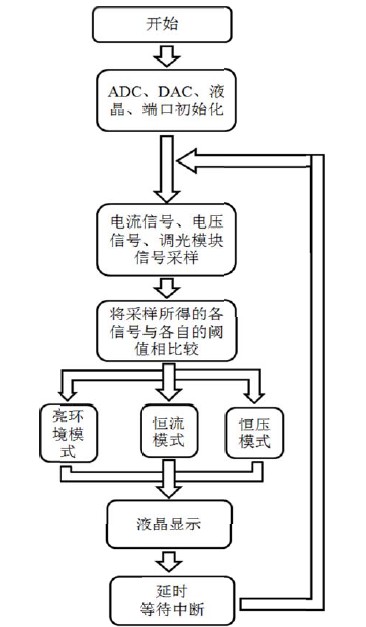 由于本LED 恒流電源工作時絕大部分時間處于穩定狀態,且對反應速度沒有過快要求,因此并不需要對電壓、電流信號進行同時的采樣,而可以分別采樣,模式切換和基準電壓的調整也不需在中斷服務中完成,只有步進調整電流的按鍵程序需要在中斷服務中完成。