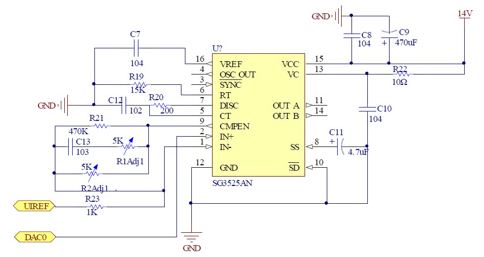 SG3525 的1、2 引腳分別為內部誤差放大器的反相輸入端和同相輸入端,反相輸入端接收反饋的電壓信號,同相輸入端為給定的電壓基準,一般接在16 引腳電壓基準的分壓上,由于題目要求恒流輸出時電流步進可調,故同相輸入端接單片機DAC 模塊產生的參考電壓。