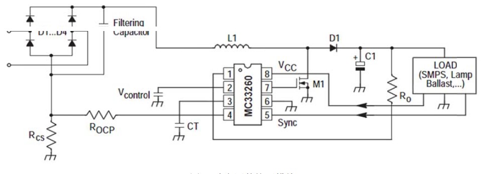 選用小功率功率因數校正芯片MC33260,它工作在電流臨界模式。MC33260應用簡單可靠。通過電流檢測和電壓反饋,通過PI調節來保持電壓恒定。通過對開關管的PWM控制來得到所需要電壓。可實現0.998的功率因數校正和輸出穩定直流電壓的功能。
