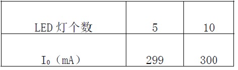 輸入電壓為36.23V,設定電流為300mA,負載從5 個LED 到10 個LED 時輸出電流波動范圍是209mA~300mA。調整率為0.4%。負載調整率SL≤1%達到要求。