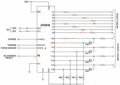 透過連接一個放在六電極Y層上的八電極X層,控制器可支持大至8寸的雙觸控屏幕,而且這種多功能控制器能感測多達六個滑塊或四十八個離散式按鍵,或按鍵、滑塊與觸摸區域的組合,該控制器為接腳數精簡的版本,利用類似的簡單布線圖(圖8),能夠驅動八條X軸和接收四條Y軸,或區分多達三十二個離散式按鍵。