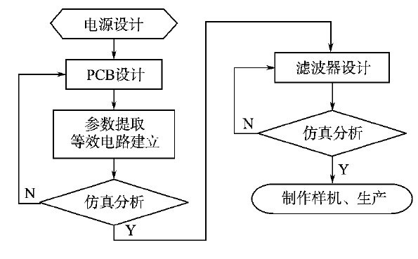 如果以上所有降低EMI的措施都完成了還沒有達到EMC的標準,就可以根據前面仿真分析得到的差模和共模干擾的波形對濾波器進行設計。在設計濾波器的時候,也同樣要注意元件的布局,還有PCB寄生參數對濾波器阻抗的影響,其本質也是增大對干擾的阻抗,使干擾無法通過傳播路徑。開關電源設計流程如圖5所示。