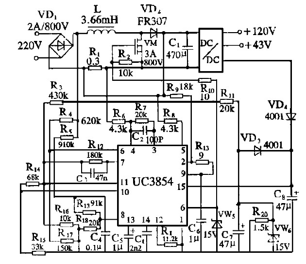 圖4  UC3854 構(gòu)成PFC 電路的大屏幕彩電開關(guān)電源原理圖[page]