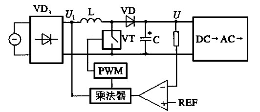 高頻有源PFC 是根據(jù)電網(wǎng)的電壓、電流及負(fù)載的變化產(chǎn)生PWM 信號(hào), 控制高頻電子開關(guān)導(dǎo)通的, 可起調(diào)節(jié)電感L 的作用。改善電流波形, 利用乘法器控制PWM 信號(hào), 可使電網(wǎng)的輸入電流基本為正弦波, 使λ接近于1( 即大于0. 99) 。圖1 示出PFC 的原理框圖。