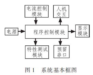 系統(tǒng)主要可以劃分為程序控制模塊、電流控制模塊、特性測(cè)試模塊和顯示模塊等4大部分,系統(tǒng)基本框圖如圖1所示。