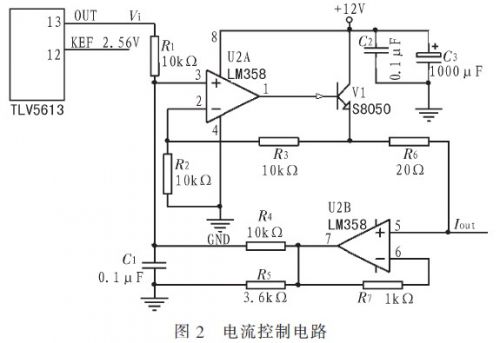 電流控制模塊:為了獲得較高的控制精度,選用12位精度的DAC(Digital-to-AnedIogueConverters,數(shù)模轉(zhuǎn)換器)TLV5613加上V/I轉(zhuǎn)換電路輸出穩(wěn)定電流值加載到測(cè)量回路,用于控制二極管的工作電流。