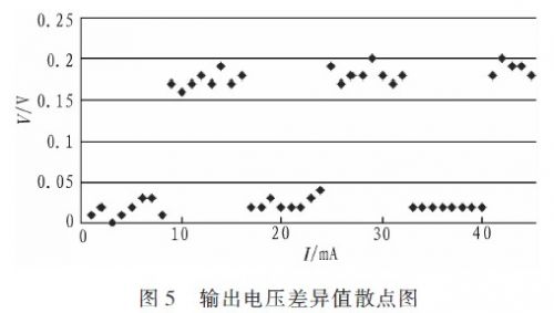 在軟硬件設(shè)計(jì)全部完成后的測(cè)試階段,發(fā)現(xiàn)DA輸出的電壓值在某些點(diǎn)上與理論值不符,具有較大差異并呈現(xiàn)一定的周期性(且都是輸出值比理論值小)。通過(guò)初步分析,認(rèn)為是DA的控制字寫(xiě)入在某些點(diǎn)上不正確,于是將硬件電路上AD的模擬電壓輸入引腳斷開(kāi)并直接接在DA電壓輸出腳,并編寫(xiě)了測(cè)試小程序,將0~5V每次遞增0.02V對(duì)應(yīng)的控制字寫(xiě)入DA,用AD測(cè)其輸出電壓值并將結(jié)果通過(guò)串口返回PC,然后將電壓理論值與實(shí)測(cè)值的差值全部導(dǎo)入Excel,然后在Excel中插入這些值的散點(diǎn)圖,散點(diǎn)圖如圖5所示,0~250mA電流值分別對(duì)應(yīng)0~5V的電壓值(圖中截取了0~45mA這一段),縱坐標(biāo)為輸出電壓理論值與實(shí)際值的差異值。