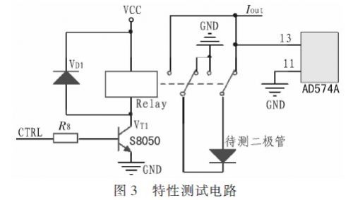 特性測(cè)試電路如圖3所示,圖中左側(cè)為繼電器控制電路,當(dāng)CTRL端為高電平時(shí),三極管VT1導(dǎo)通,VCC通過(guò)VT1加載到繼電器5引腳,繼電器動(dòng)作,被測(cè)二極管接入極性轉(zhuǎn)換,二極管極性匹配后,即可進(jìn)行特性測(cè)試。
