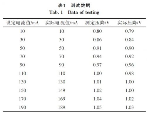 被測(cè)二極管采用1N4118,用2個(gè)優(yōu)利德數(shù)字萬(wàn)用表UT33D作為測(cè)量?jī)x器對(duì)系統(tǒng)進(jìn)行測(cè)試,其中一個(gè)以毫安檔(量程200mA)與被測(cè)二極管串聯(lián),另一個(gè)以直流電壓檔(量程5V)與被測(cè)二極管并聯(lián),在不同的設(shè)定電流值下測(cè)量二極管的實(shí)際電流和電壓,測(cè)試結(jié)果如表1。