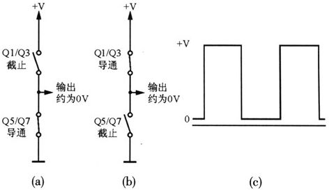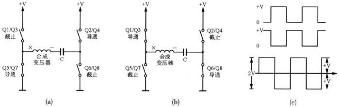 在射頻激勵(lì)信號(hào)的負(fù)半周,MOS管QI/Q3截止,QS/Q7導(dǎo)通,如圖5(a)所示。而在射頻激勵(lì)輸入信號(hào)的正半周,MOS管Q1/Q3導(dǎo)通,QS/Q7截止,如圖5(b)所示。Q2/Q4和Q6/Q8的開關(guān)情況與此正好相反。跨在功率合成變壓器初級(jí)兩端的輸出信號(hào)就在半個(gè)周期里,在地(約為0V)和正電源間進(jìn)行一次切換,如圖5(c)所示。