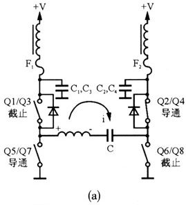 在射頻周期的負(fù)半周,Ql/Q3和Q6/Q8處于截止?fàn)顟B(tài),相當(dāng)于開關(guān)斷開;Q2/Q4和QS/Q7則是飽和導(dǎo)通的,相當(dāng)于開關(guān)接通。Q2/Q4和QS/Q7串聯(lián)導(dǎo)通電源電壓為+V,若忽略MOS管的飽和壓降,+V將全部降落在合成變壓器上。在射頻周期的正半周,Q1/Q3和Q6/Q8處于導(dǎo)通狀態(tài),Q2/Q4和QS/Q7為截止?fàn)顟B(tài)。Ql/Q3和Q6/Q8串聯(lián)導(dǎo)通電源電壓+V,+V全部降落在合成變壓器上。由圖4可見,合成變壓器初級(jí)電壓方波輸出相差180°,說明輸出電壓的峰峰值為+2V。MOS開關(guān)的作用就是有效地將整個(gè)電源電壓跨接在合成變壓器的初級(jí)繞組上,在射頻激勵(lì)信號(hào)的每半個(gè)周期是反相的。作為全橋組態(tài),輸出就是兩倍電源電壓的射頻輸出。為了防止直流電壓通過變壓器的繞組通地,應(yīng)在每部分的射頻輸出都串聯(lián)有隔直電容C。
