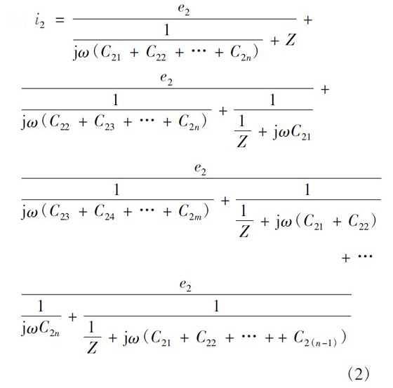 在僅二次繞組有感應電動勢、一次繞組電動勢為零的情況如圖6 所示。圖6 中:e2為每匝二次繞組的感應電動勢;C2x為一匝二次繞組與一次繞組最外層間的寄生電容。