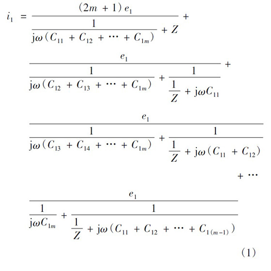 設一次繞組有3 層,每層m 匝,二次繞組僅一層,為n 匝。當變壓器磁芯中的磁通發生變化,便會同時在一次側和次級產生感應電動勢。根據疊加定理,可認為這是僅一次繞組有感應電動勢、二次繞組電動勢為零和僅二次繞組有感應電動勢、一次繞組電動勢為零兩種情況的疊加。僅一次繞組有感應電動勢、二次繞組電動勢為零的情況如圖5 所示。圖5 中:e1為每匝一次繞組的感應電動勢;C1x為一匝最外層一次繞組與二次繞組間的寄生電容。